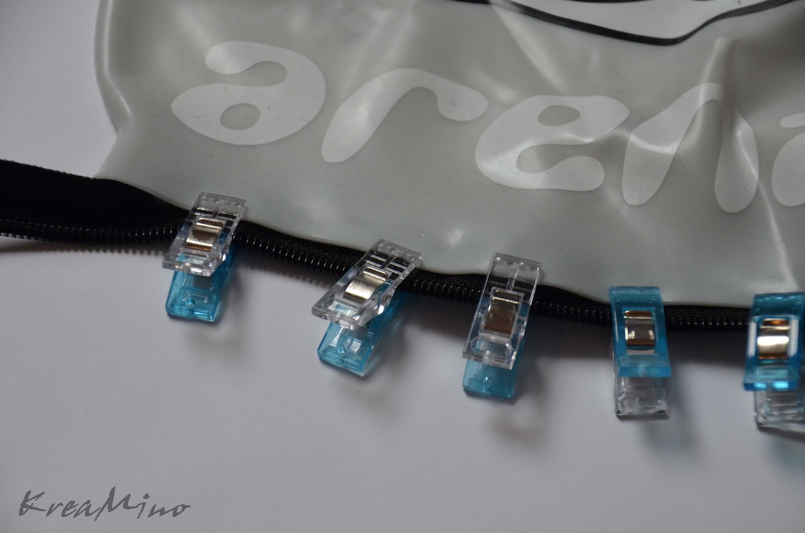 Das habe ich einfach auf die obere Kante der Badekappen geklebt und es beim Reißverschluss annähen mit festgenäht und dann abgezogen. So konnte ich gemütlich und ohne Quälerei den Reißverschluss einnähen .