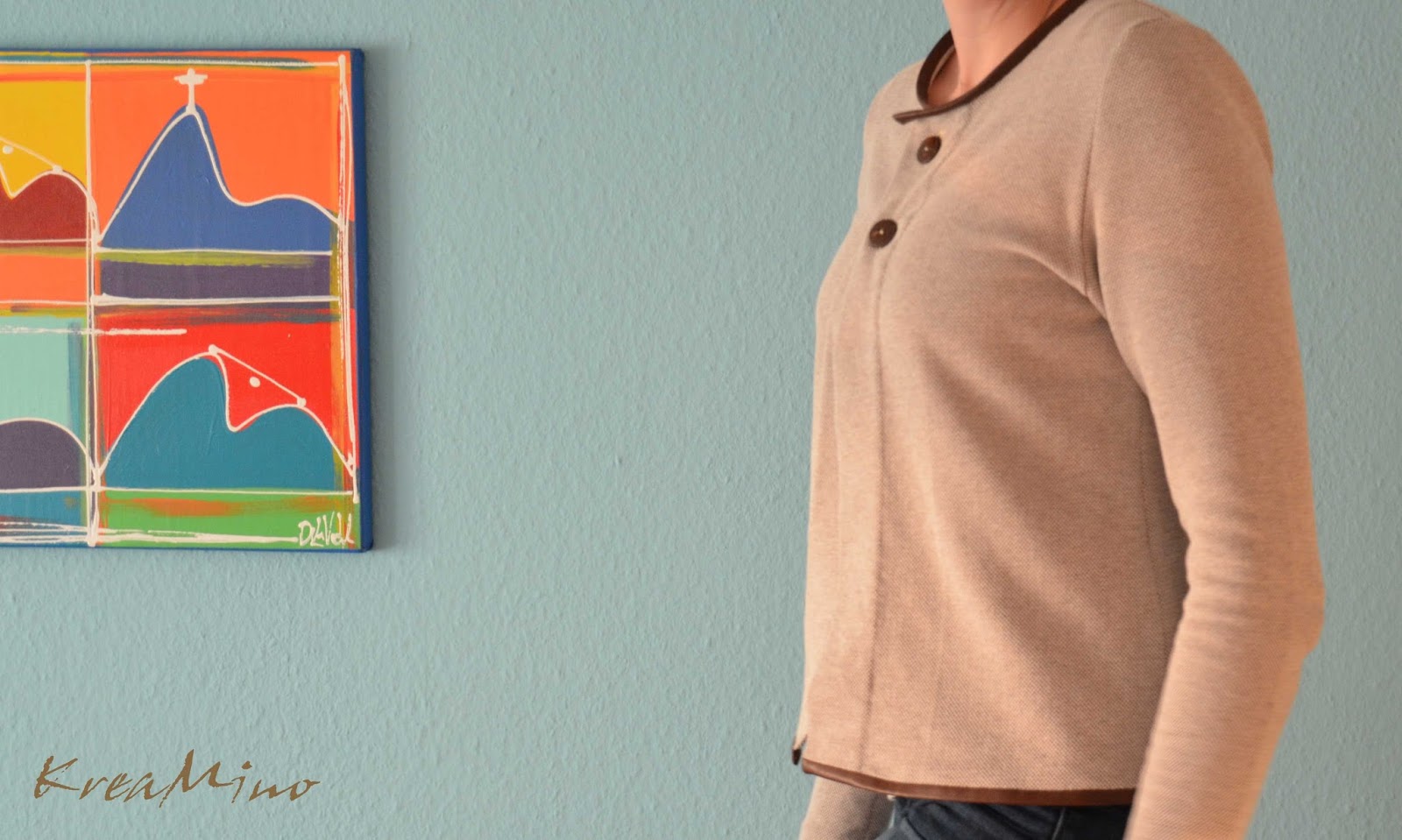 Verschlossen wird das Jäckchen vorne mit 2 Kokosknöpfen, die ich bei Mut mit Stil gefunden habe. Sie passen farblich perfekt und das Jäckchen hat durch die Position der Knöpfe einen tollen Fall. Seit der Fertigstellung trage ich es ständig und es ist absolut bürotauglich und passt sowohl zu Jeans als auch zum Kleid.