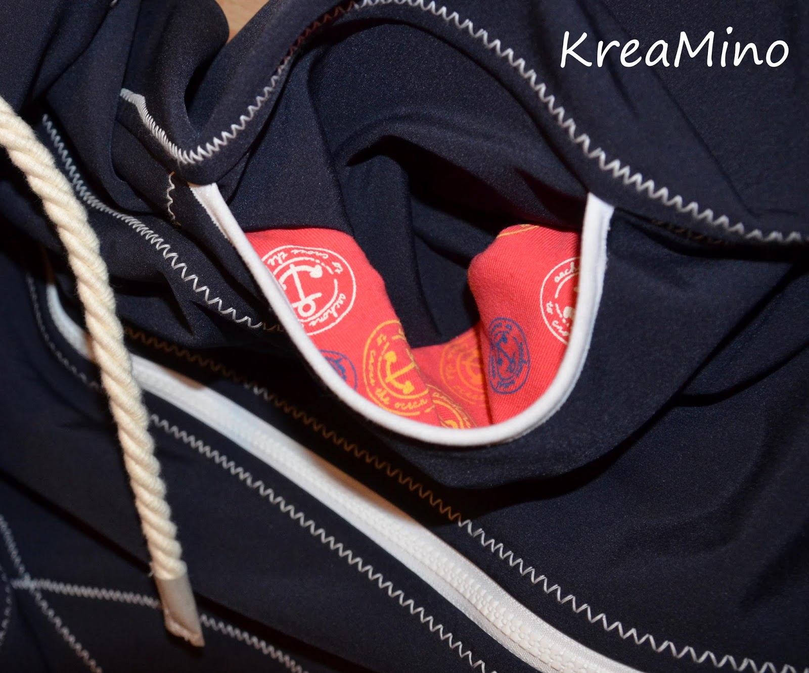 Gefüttert ist die Kapuze mit einem Jersey, den ich vermutlich nicht gekauft hätte, wenn meine Einkaufsberatung nicht gesagt hätte: Das bist du! Du musst genau diesen Ankerjersey kombinieren! Gesagt getan…. Damit die Kordel eine guten Führung hat, habe ich die Kapuze mit Beleg verarbeitet und das Jerseyfutter entsprechend kleiner zugeschnitten.